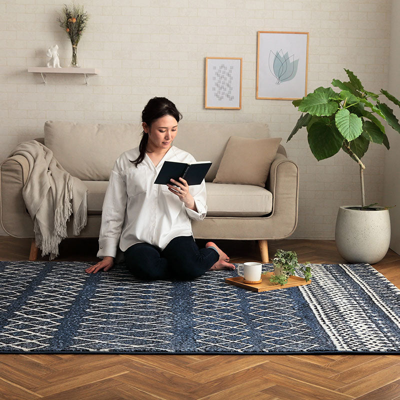 本商品の『繊維の密度を表すノット数』は112,000ノットです。 ポリプロピレンを使用しているので汚れが付着しにくく、遊び毛や毛玉が非常に出にくいという特徴もあります。 また経糸にジュート糸を使用しているため、抗菌防臭や消臭機能があり一年を通して安心してお使いいただけます。