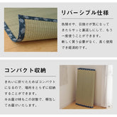 い草は使用するうちに日焼けをしますが、真中の青の部分を多く使用したものほど、全体が綺麗にムラなく日焼けし、味が出ます。国産(九州産)のい草を使用しています。国産い草は一本一本が太く、表皮が厚く繊維がキメ細かいので弾力性があり、耐久性に優れています。い草には空気の清浄化作用、湿度の調節作用があり、汚れにくいといった特徴があります。い草に青森ヒバ加工を施しています。(抗菌、防臭効果)表裏の両面が使えて経済的です。