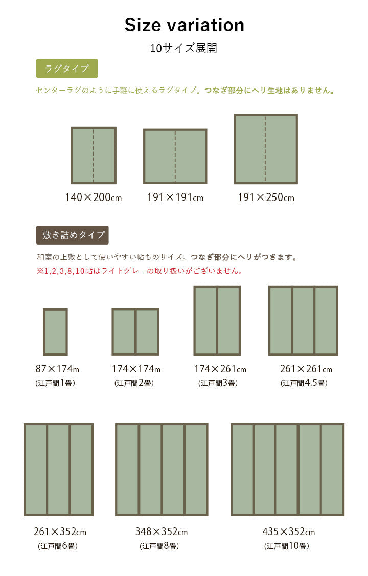 国産(九州産)のい草を使用しています。一本一本が太く、表皮が厚く繊維がキメ細かいので弾力性があり、耐久性に優れています。ご家庭のフローリングの色や家具、カーテンなどにも合わせやすく、1枚敷けばより一層おしゃれな空間を作ることができます。3色展開でお部屋にあった色を選ぶこともできます。