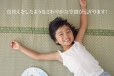 い草には空気の清浄化作用、湿度の調節作用があり、汚れにくいといった特徴があります。青森県のヒバの木から抽出した「ヒバエッセンス」をメーカー独自の技術で生地表面に加工しました。ヒバエッセンスにはヒノキチオールという、天然物質としては極めて抗菌性の高い成分が含まれています。(無加工品に比べ抗菌防臭効果があります。)表裏の両面が使えて経済的です。