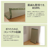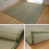 い草には空気の清浄化作用、湿度の調節作用があり、汚れにくいといった特徴があります。青森県のヒバの木から抽出した「ヒバエッセンス」をメーカー独自の技術で生地表面に加工しました。ヒバエッセンスにはヒノキチオールという、天然物質としては極めて抗菌性の高い成分が含まれています。(無加工品に比べ抗菌防臭効果があります。)表裏の両面が使えて経済的です。