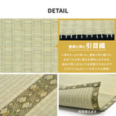 引目織は、たて糸が表に出ないので汚れにくく表面も滑らかで、ごみがたまりにくい特徴があります。 国産い草を使用して畳と同じ織り方で織り上げ、強度のある縁で縫製しています。