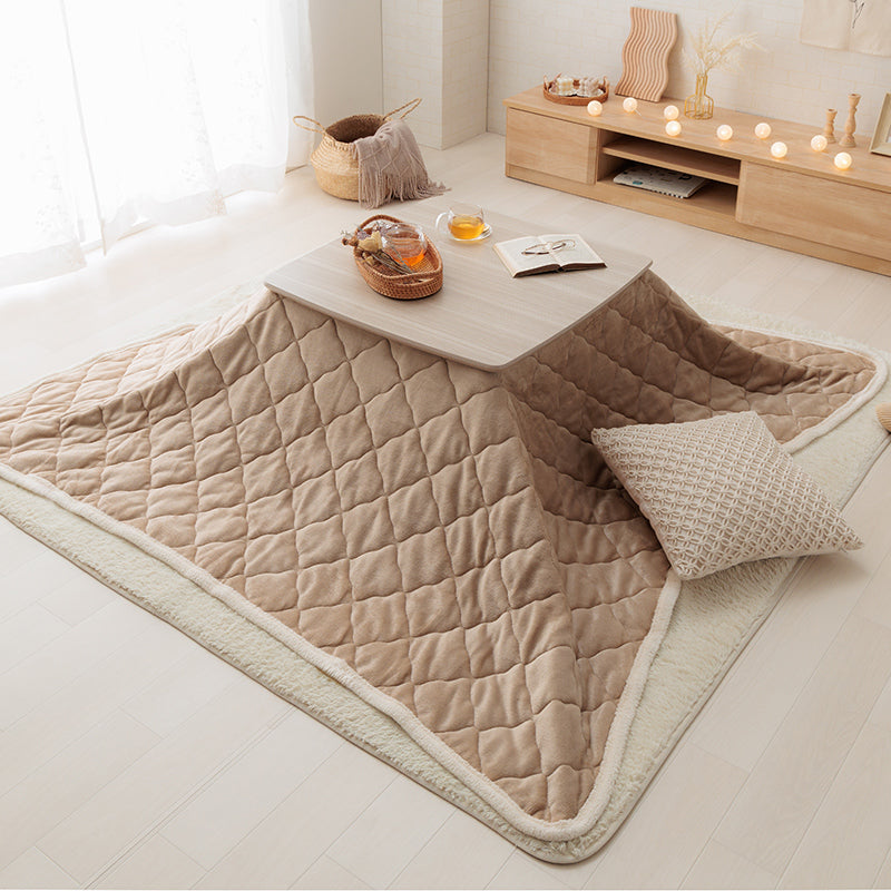用途はこたつ上掛けカバーだけでなく、こたつ掛け布団・中掛け布団・ブランケットとしてなど使い方は様々です。 リバーシブル仕様で、両面にふんわりやわらかなフランネル素材を使用しています。 可愛いキルティングも施されておりますので、綿ズレを防止できて使い心地も抜群です。 フチ部分はふわもこなボア仕様で、こたつに入った時に体にフィットします。 洗濯機で洗えるので清潔にご使用できます。(洗濯ネットをご使用ください) コンパクトに収納できるので、収納スペースが少ない方にもおすすめです。