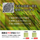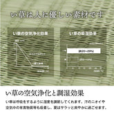 い草は使用するうちに日焼けをしますが、真中の青の部分を多く使用したものほど、全体が綺麗にムラなく日焼けし、味が出ます。国産(九州産)のい草を使用しています。国産い草は一本一本が太く、表皮が厚く繊維がキメ細かいので弾力性があり、耐久性に優れています。い草には空気の清浄化作用、湿度の調節作用があり、汚れにくいといった特徴があります。い草にヒバエッセンス加工を施しています。(抗菌防臭効果)表裏の両面が使えて経済的です。