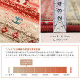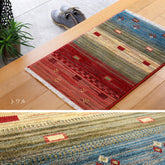 民族調手織り絨毯の様なエスニックなデザインをウィルトン織機で織り上げました。毛足は1cm程ありますが密度が高く、掃除機もかけやすいようデザインされています。縦糸の特殊加工により生地がやわらかく、折りたたんで収納出来ます。