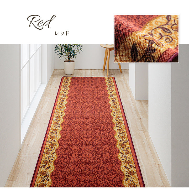 クラシカルな印象の上品な商品です。廊下敷きとしても、キッチンマットとしてもご使用頂けます。表地には丈夫で汚れにくいナイロンを使用しているため耐久性にも優れた商品です。裏面にはすべりにくい加工を施しています。