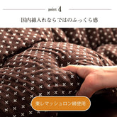 昔から日本になじみのある、刺し子。 和柄に多い柄ですが、フローリングとの相性も良くお部屋に合わせやすい柄です。 性別年齢問わず使っていただけるデザインとなっております。 綿の産地インド綿生地を使用しています。 洋間にもマッチするデザイン。 ふっくらとしたボリューム感は国内で綿入加工をしている商品だからできる仕上がり。 1枚1枚丁寧に仕上げた安心の品質です。