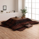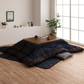 和モダン柄のこたつ布団です。熱が逃げにくいフィットキルト加工を施しています。生地に撥水加工を施しています。生地には肉厚で張りと光沢のある綿素材を使用しています。こちらの商品は国内でプリント、綿入れしています。日本製のプリントらしい上質な質感と繊細な文様をお楽しみ下さい。部分暖房のこたつは電気代もおトクです。