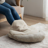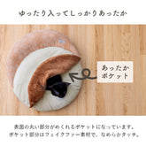 飼い主さんの足と一緒に、ペットもポケットの中に入ってあたたまれます。また、クッションの上にペットが乗ってくつろぐこともできます。 商品は、表面の丸い部分がめくれるポケットになっています。 ポケット部分はフェイクファー素材で、なめらかなタッチ感です。