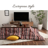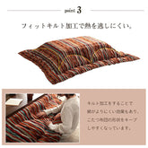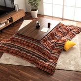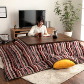 多彩な色糸を使ってデザインの異なる柄と幅で作り上げたストライプ調のこたつ布団。