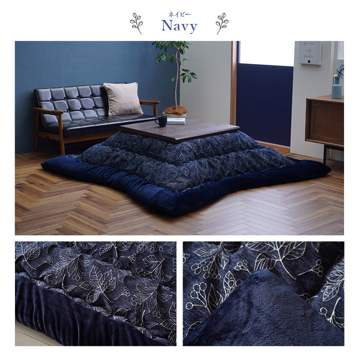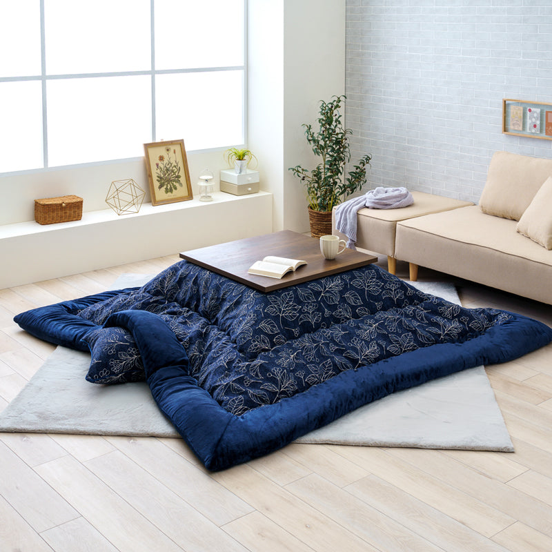 シェニール糸を使用し、高級感と光沢感のあるこたつ布団に仕上げました。 ふっくらとしたボリューム感は国内で綿入加工をしている商品だからできる仕上がりです。 裏地にはあったか素材のフランネルを使用しています。 同じデザインのクッションを取り入れて、統一感のあるお部屋にアレンジもできます。