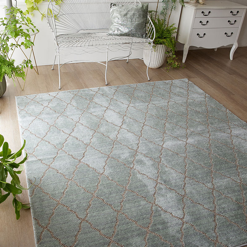 グランドに微妙な濃淡差をつけ、深みのある色味にしています。優しい色味でまとめた上品な雰囲気のラグです。