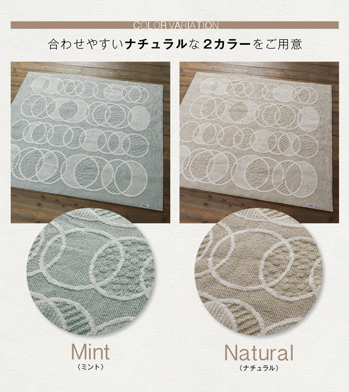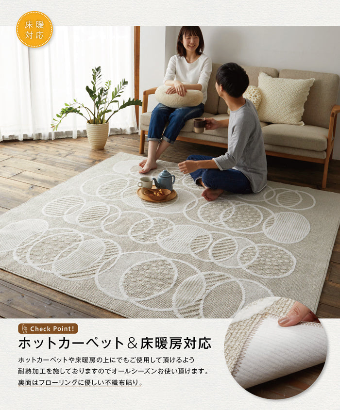 北欧ナチュラルなカラーなので木調の家具にも合わせやすく、お部屋をくつろぎ感のある快適空間に。 面積の大きいラグとバランスの良い大きめの丸柄は、色だけでなく織りで柄を表現することで馴染みやすい飽きないデザイに仕上げました。