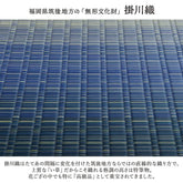 福岡県筑後地方の無形文化財「掛川織」の技法で織り上げた花ござです。掛川織は経糸の間隔に変化を付けた直線的な織り方で、上質な草だからこそ織れる格調の高さは特筆物。花ござの中でも特に高級品として重宝されてきました。