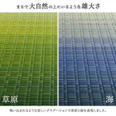 大きな目と小さな目を交互に織り込んだ美しく洗練されたデザインが人気です。国産(九州産)のい草を使用しています。一本一本が太く、表皮が厚く繊維がキメ細かいので弾力性があり、耐久性に優れています。い草には空気の自然浄化作用、湿度の調節作用などがあります。青森産天然ヒバから抽出した植物由来成分で抗菌防臭加工をほどこしています。希少な国産い草を用いて、ベテラン職人が、長年の経験を活かし、国内工場で丹念に織りあげました。吸い込まれるような美しいグラデーションで草原と海を表現、まるで大自然の上にいるような雄大さを感じられます。