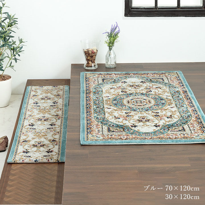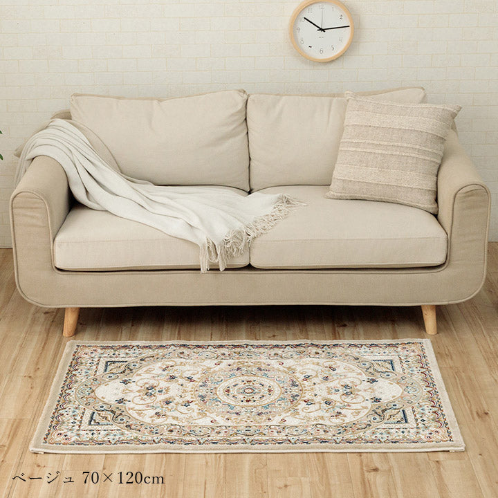 クラシック柄のウィルトンマットです。 伸縮性のある特殊な糸を使用することで、立体感を持たせ繊細なデザイン画に仕上げております。ウィルトンは家の中でも靴を履いて生活するヨーロッパで、土足で扱うことを前提として作られております。そのため、耐久性に優れており、長時間踏みつけてもヘタりにくく、弾力性もあり長くご使用頂けます。