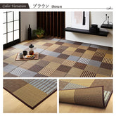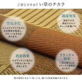織り方によって違う複数の肌感触をお楽しみ頂けます。落ち着いた色目でモダンな雰囲気に仕上げました。国産(九州産)のい草を使用しています。一本一本が太く、表皮が厚く繊維がキメ細かいので弾力性があり、耐久性に優れています。い草には空気の自然浄化作用、湿度の調節作用などがあります。また汚れにくく、使用するうちに黄金色に変化し味が出ます。い草にヒバエッセンス加工を施しています。(抗菌防臭効果)