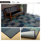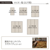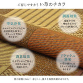 織り方によって違う複数の肌感触をお楽しみ頂けます。落ち着いた色目でモダンな雰囲気に仕上げました。国産(九州産)のい草を使用しています。一本一本が太く、表皮が厚く繊維がキメ細かいので弾力性があり、耐久性に優れています。い草には空気の自然浄化作用、湿度の調節作用などがあります。また汚れにくく、使用するうちに黄金色に変化し味が出ます。い草にヒバエッセンス加工を施しています。(抗菌防臭効果)裏にはフローリングを傷つけにくいよう不織布を貼っています。