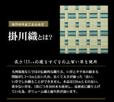掛川織は九州筑後地方の伝統的な織り方です。大きな目と小さな目に交互に織り込んだ美しく洗練されたモダンなデザインが人気です。また、厳選された良質の太く長いイ草を高密度に織り込んでいますので丈夫で耐久性があり、しかも素足に心地よいクッション性とボリューム感があります。い草には空気の自然浄化作用、湿度の調節作用などがあります。また汚れにくく、使用するうちに黄金色に変化し味が出ます。い草にヒバエッセンス加工を施しています。(抗菌防臭効果)